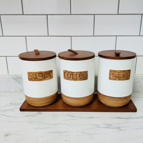 3-Pc Ceramic Canister Set With Bamboo Tray